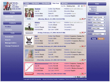 - Utilities such as Searching, Sorting and Filtering Profiles on multi criteria viz. Nickname, age, gender, education, hobbies, occupation, language, zodiac sign, zip code, country and state.