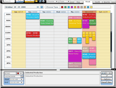 Calendar events such as Earnings announcements, Board Meetings, Regulatory Filings play very important role for traders. An efficient display and access of Market events calendar is very critical to professional traders and novice traders alike. This tool collates all the market events dates in the form of a calendar and display efficiently. Multiple Events and Event groups can be created and this tool visually represents these events on the Calendar in Day, Week, Month, Quarter, Agenda views.